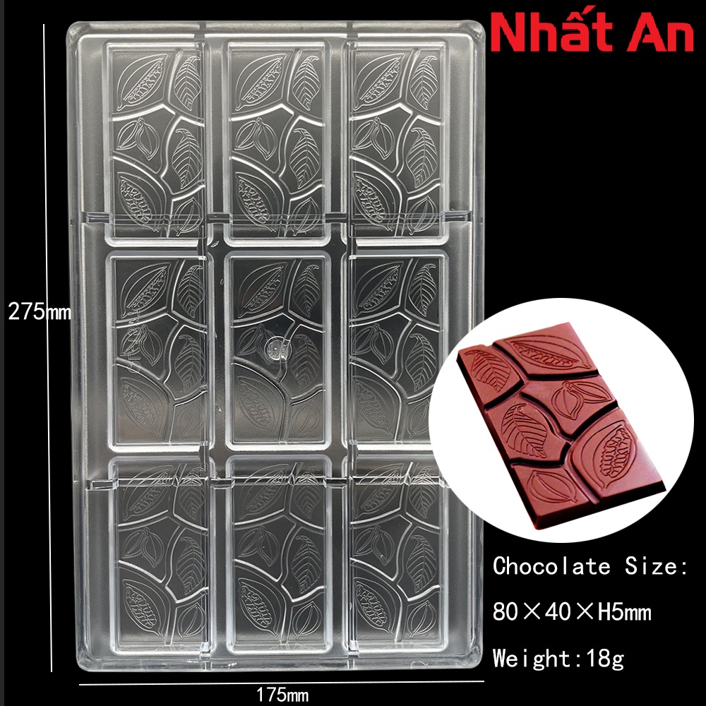 1 khuôn có 9 ô nhỏ, kích thước mỗi ô 8x4x0.5cm, trọng lượng mỗi ô 18gr