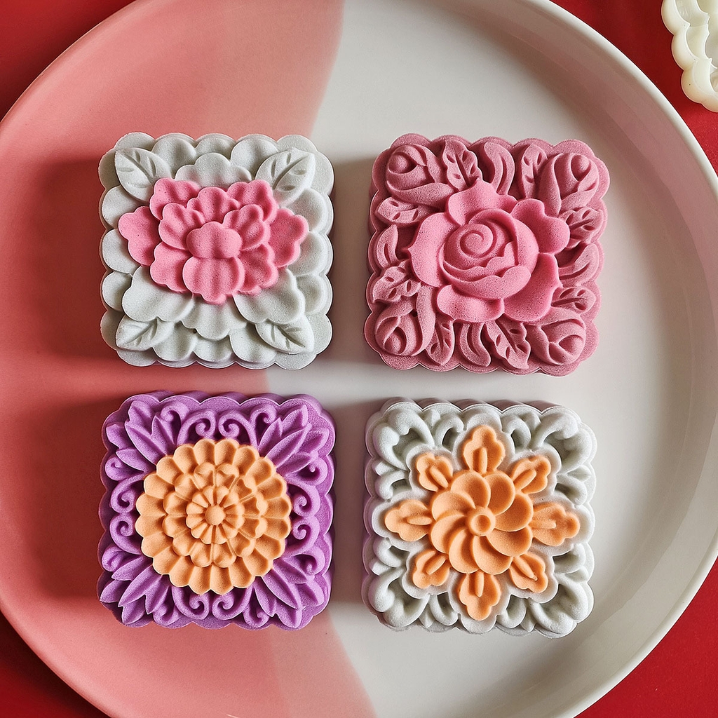 Khuôn trung thu vuông 4 mặt hoa 3D 150gr - 180gr